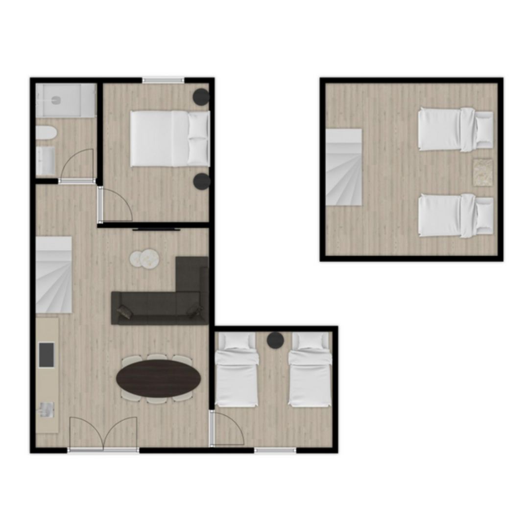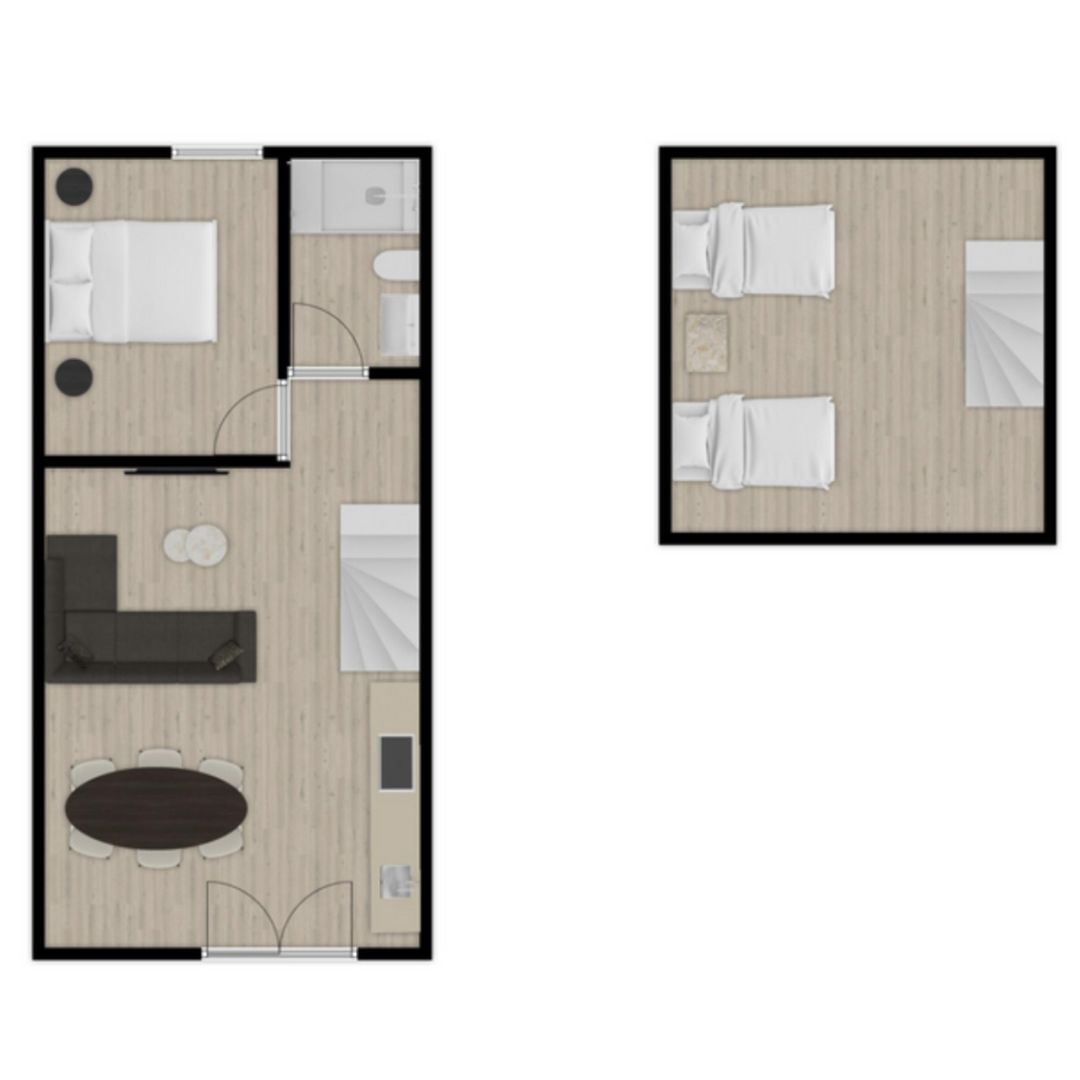 Woning 2 is vergelijkbaar met woning 1, net zo compleet en sfeervol ingericht. Ook hier vindt u een slaapkamer met tweepersoonsbed beneden en twee losse bedden boven. Dankzij de vloerverwarming, moderne badkamer en luxe keuken voelt u zich direct thuis. Buiten wacht een gezellig terras.